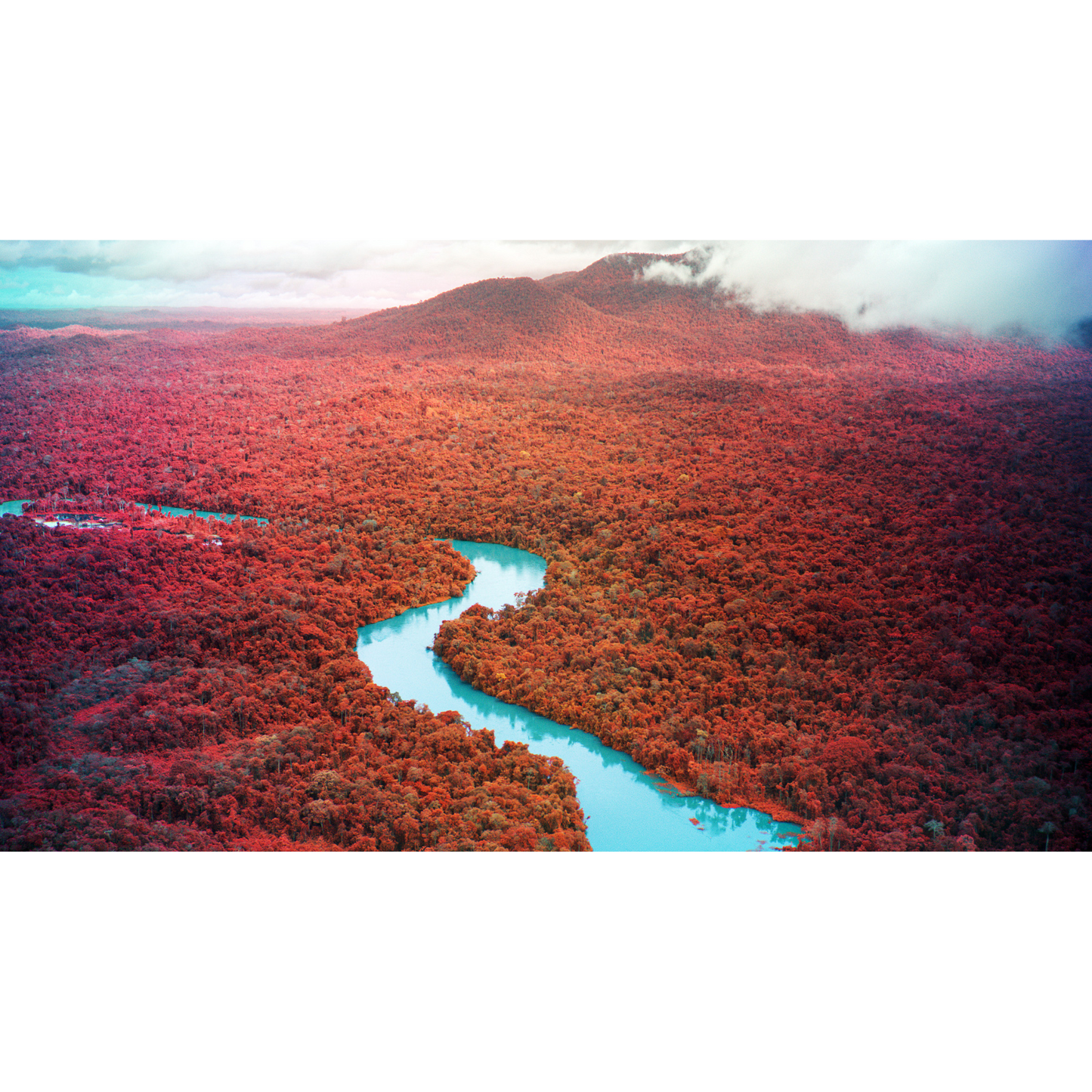 The limited edition print features an image taken from Mosse’s video Broken Spectre (2022). Still from Broken Spectre XIV (2022) is an aerial shot created by a specially-made Geographic Information System (GIS) imaging technology that Mosse and his team collected by drone. The same technology is also commonly used by scientists reporting on ecological damage and by companies looking for new mining and agribusiness prospects in the region. The photographs are made using multispectral imaging techniques to capture narrow bands of light at specific points across the electromagnetic spectrum, some of which are beyond human perception. The resulting colour and saturation in this work, while hauntingly beautiful, reveals the scale and extent of natural decimation in the Amazon Basin and related ecosystems.