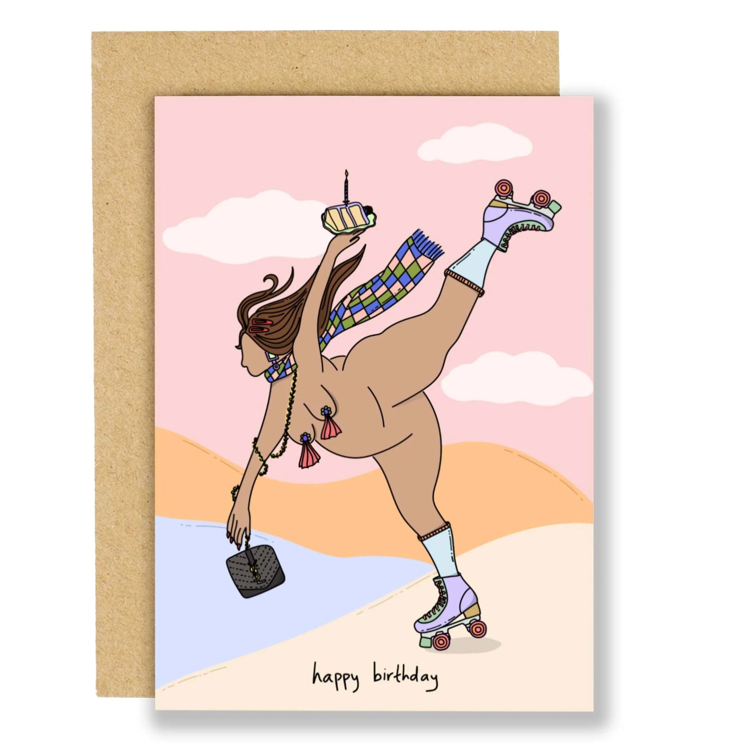 Our favourite nipple-tasselled gal is back - and this time she is bringing birthday cake! Send this fun birthday card to a pal you know will appreciate this vibe.
