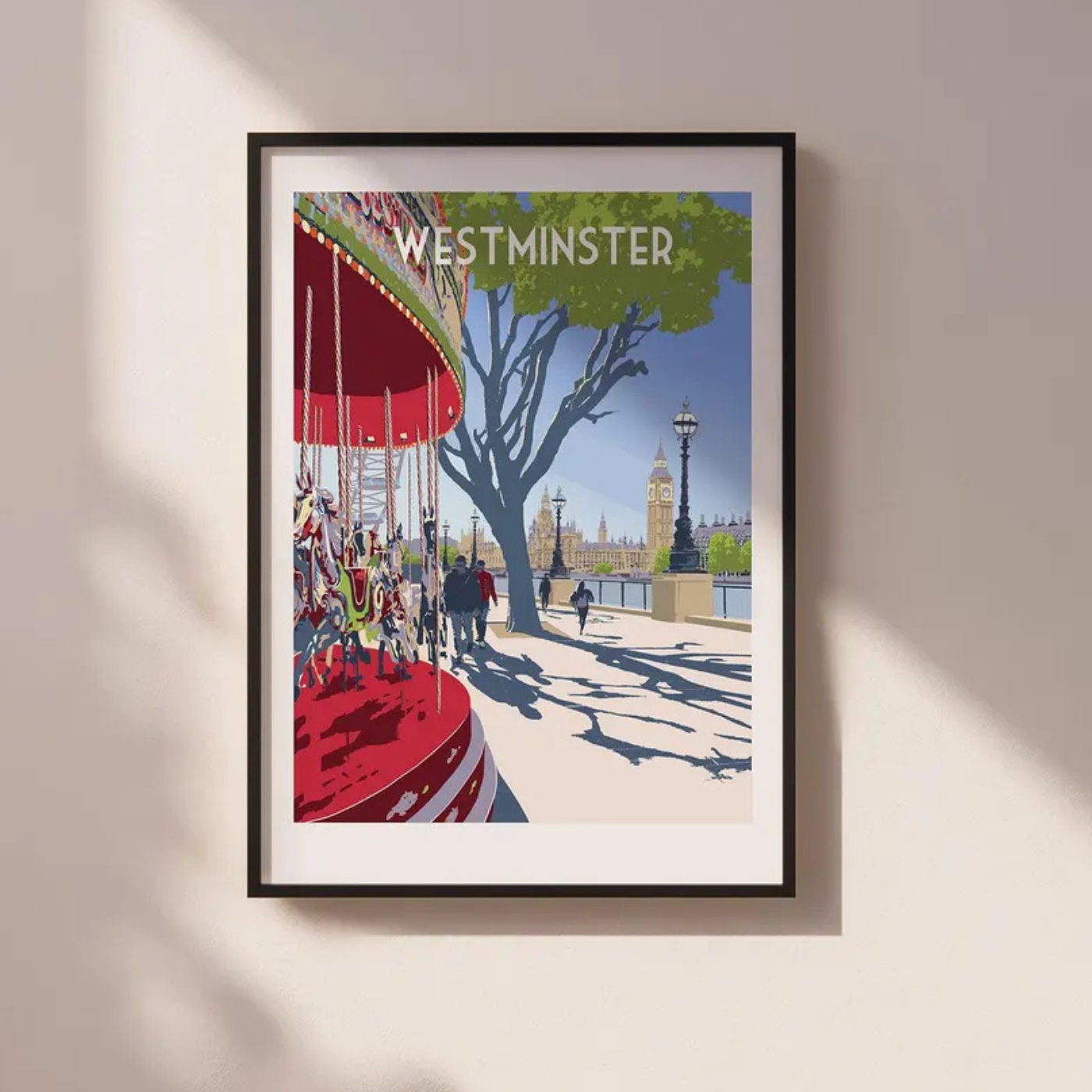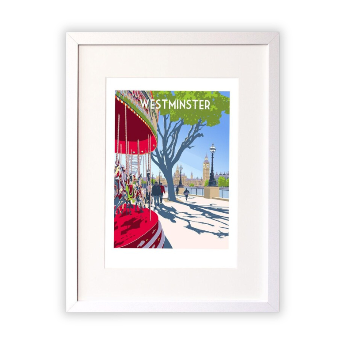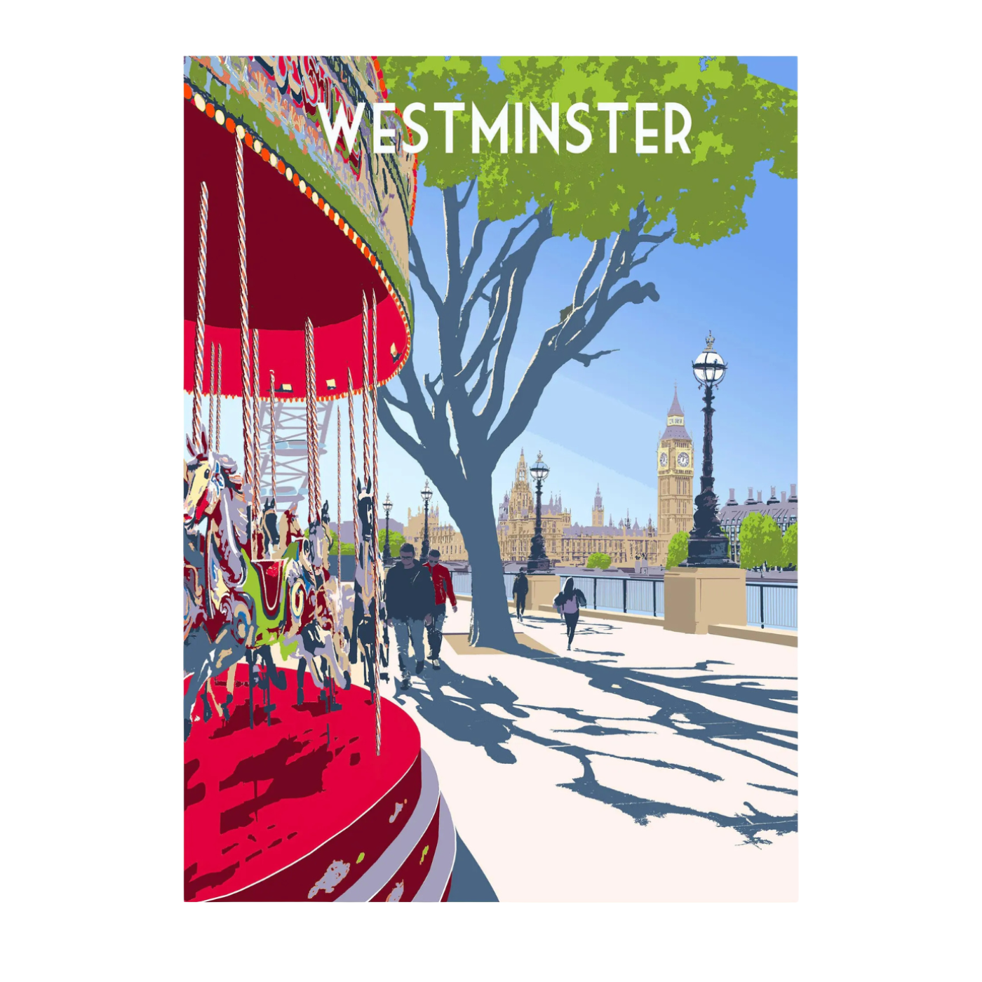 Signed and numbered limited edition run of 150 hand-pulled screen prints depicting the iconic Westminster Palace and Parliament from the South Bank of the Thames in a bold graphic, modern art style.in a bold graphic, modern art style.