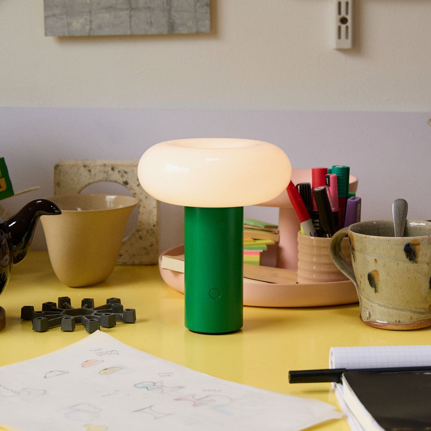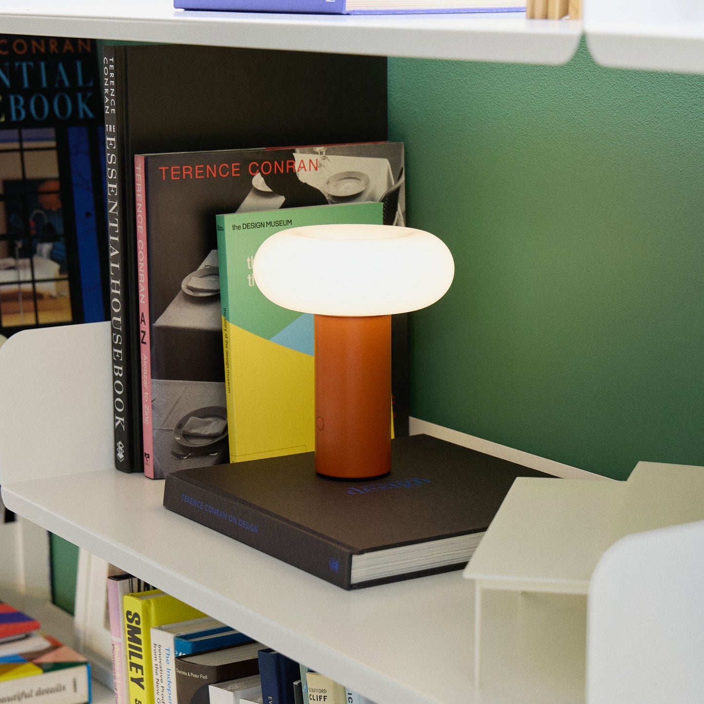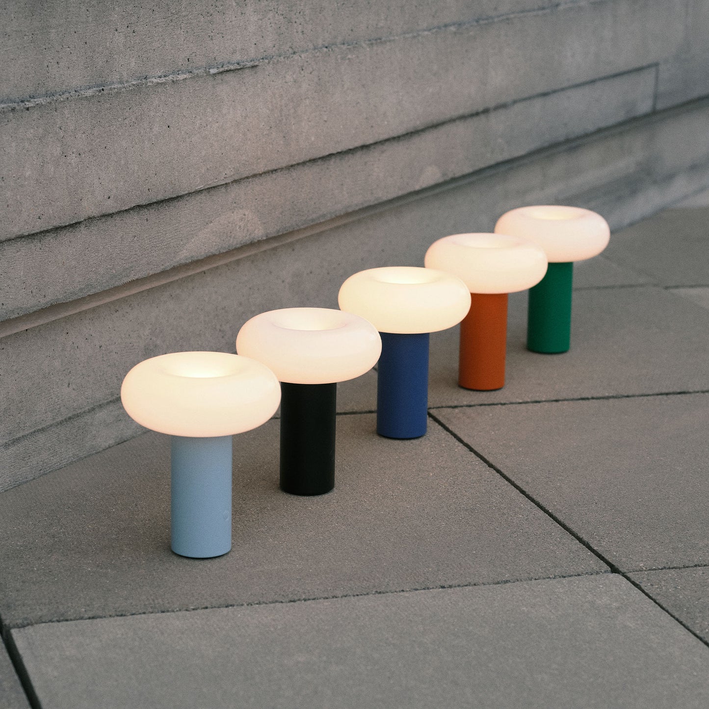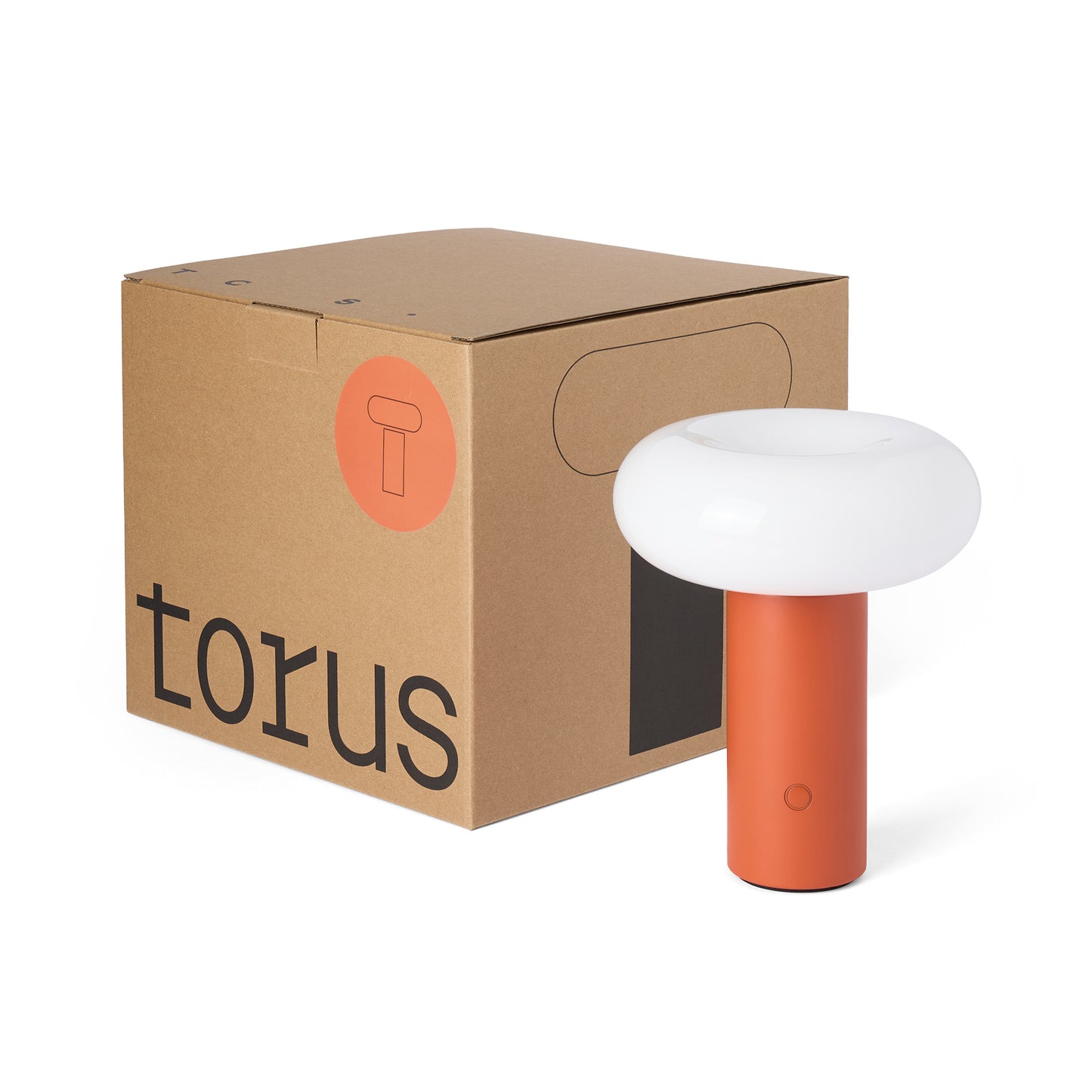 The Torus Portable Lamp offers simplicity with everyday adaptability. Its opal glass shade casts a warm, diffused glow. The lamp takes its name from the toroidal-shaped form of the shade. It is USB-rechargeable with a step-less dimmer and is supplied with a Type-C USB cable and magnetic charger.
