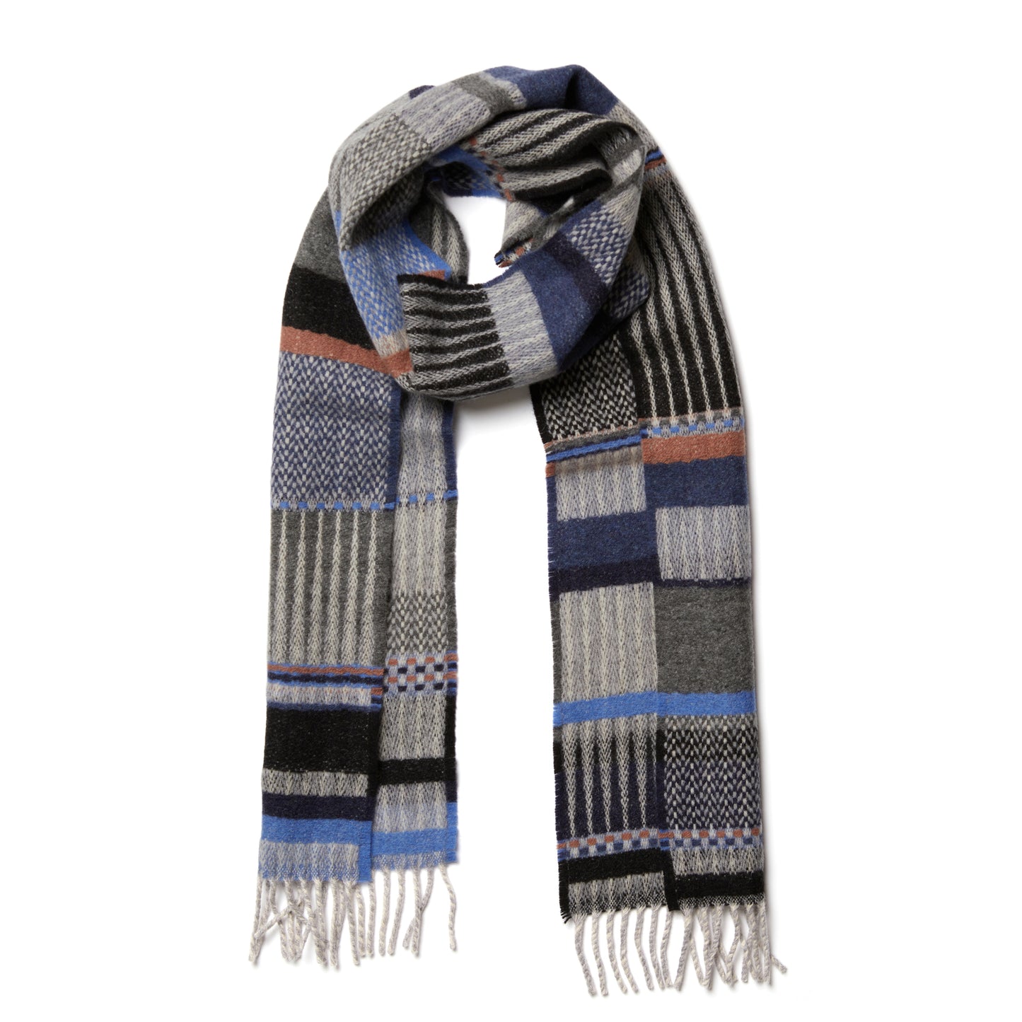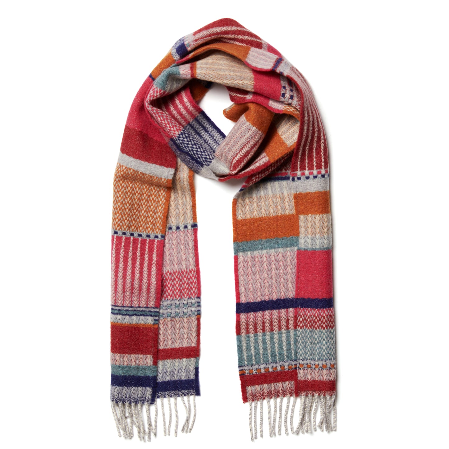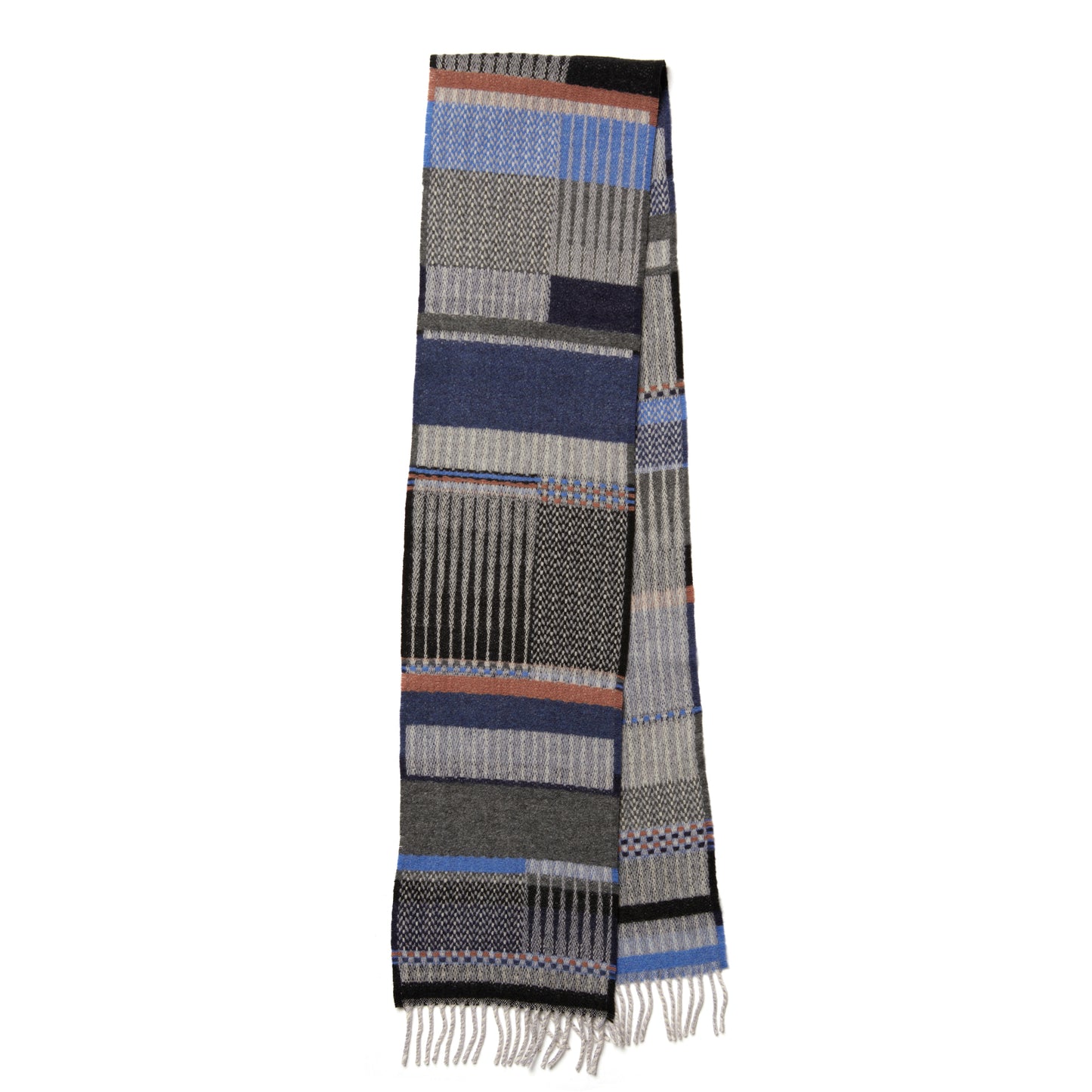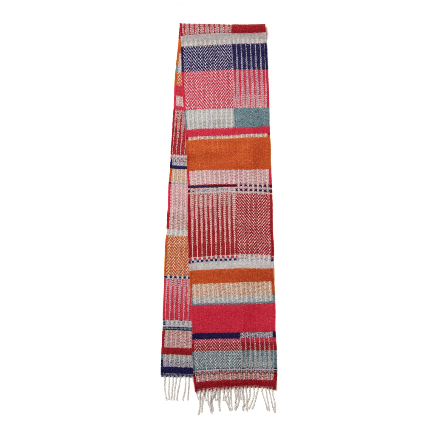 The inspiration for the design of this scarf draws directly from the perspectives embedded within the flat landscapes frequently depicted in the artistry of Fred Ingram's. Specifically, the elongated triangles adorning the fabric are a nod to the visual elements found in his paintings. Complemented by substantial solid colour blocks and textured patterns, the overall aesthetic pays homage to the patchwork seen in the fields that serve as a focal point in Ingrams' body of work.