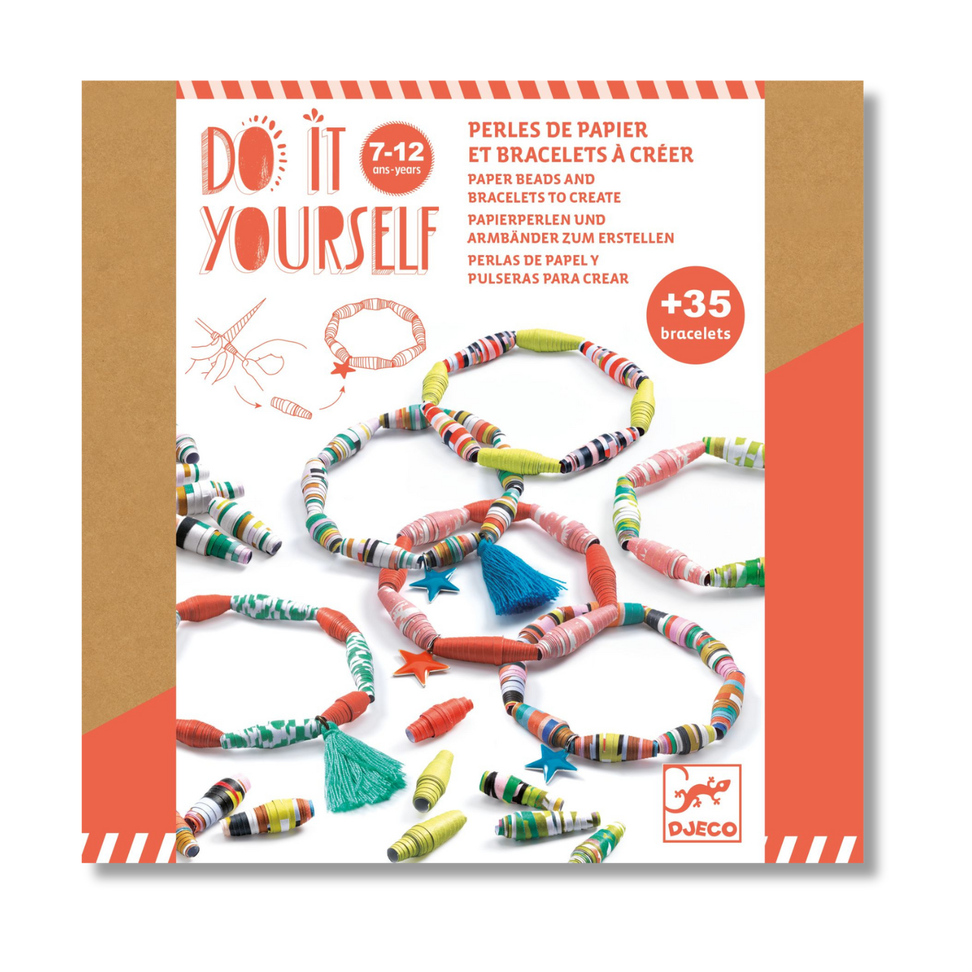 An arts and crafts kit for creating all sorts of coloured bracelets from handmade paper beads.