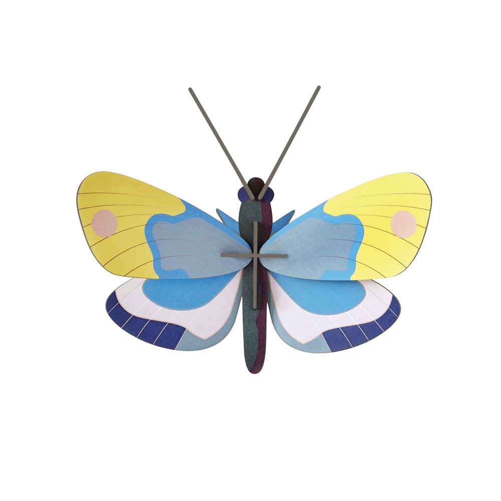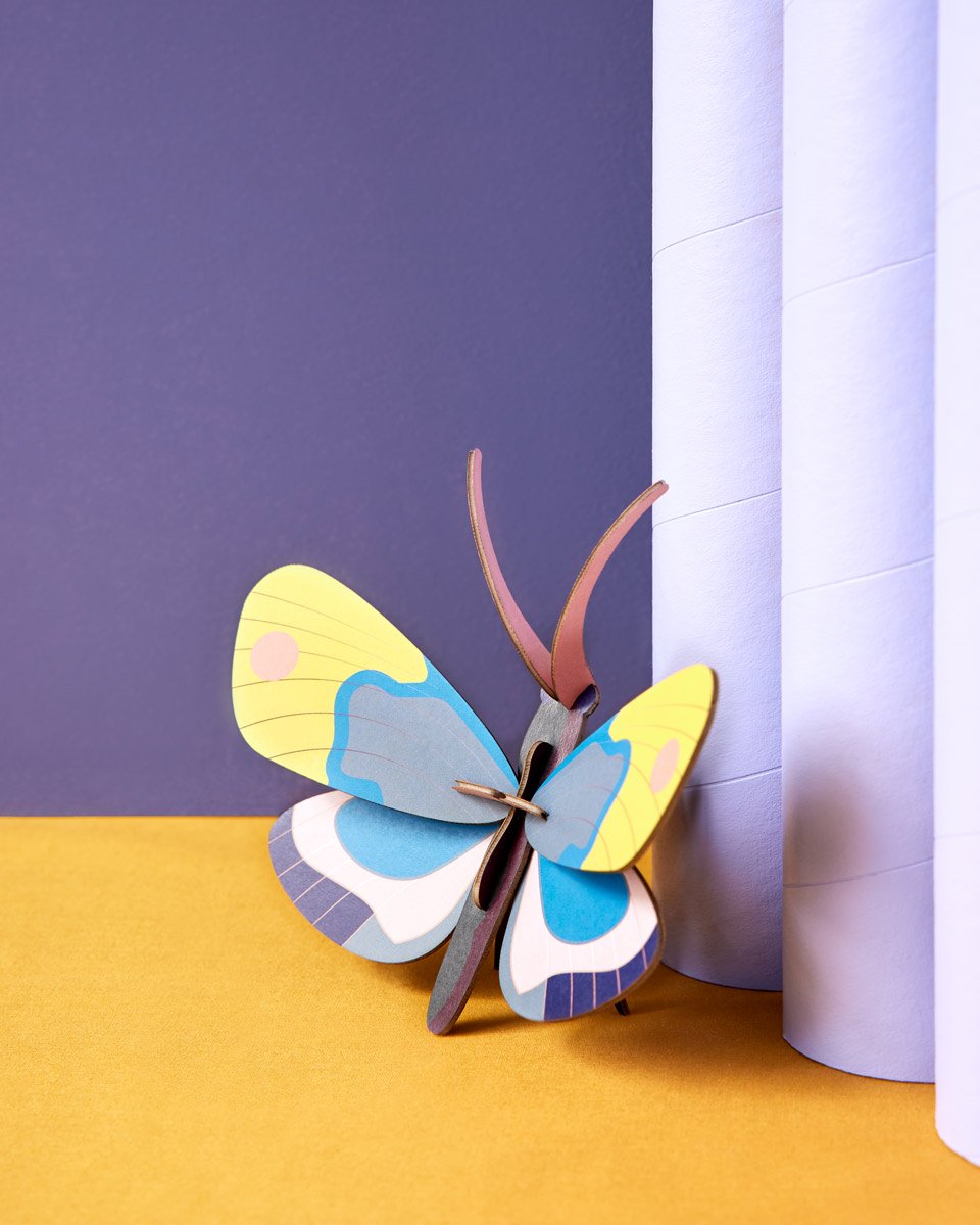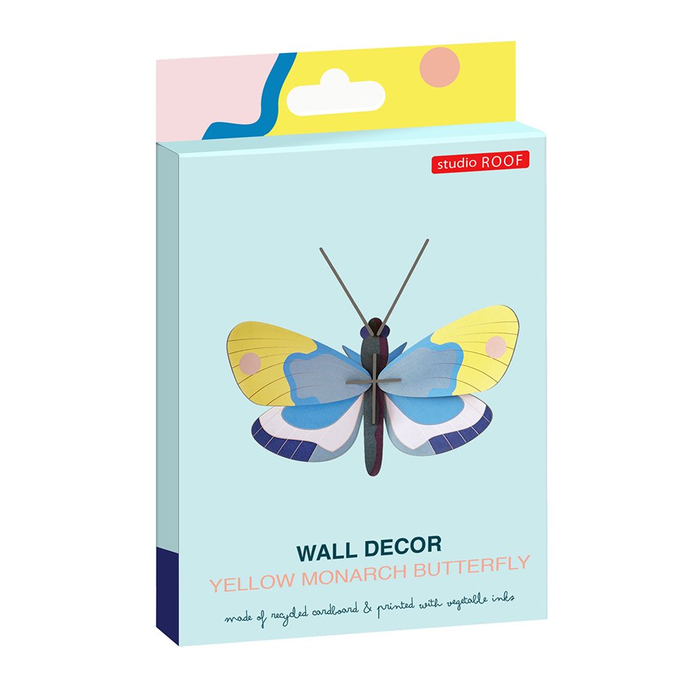 The Studio Roof Yellow Monarch Butterfly is a small flat-packed decorative model made from recycled cardboard. The recycled cardboard is treated with vegetable dyes to give it a bright multicoloured and eco-friendly finish. This Yellow Monarch Butterfly has a mix of pink, blue, white and brown, which really make the model pop and brings the creature to life!