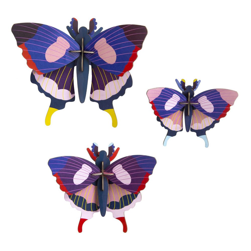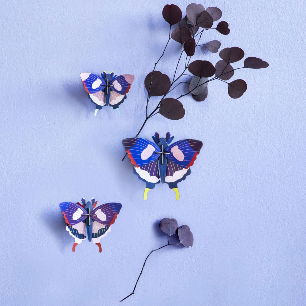 A set of three models in decreasing sizes, these eco wall decorations are made from recycled cardboard and printed with plant-based inks. These stunning butterfly wall art models have a stylish, contemporary look, with stylised lines and brightly coloured in shades of blue, purple and pink with intricate markings on their wings. Studio ROOF models make a great introduction to the wonderful world of insects. This impressive wall decoration will make a statement in any room of the house!