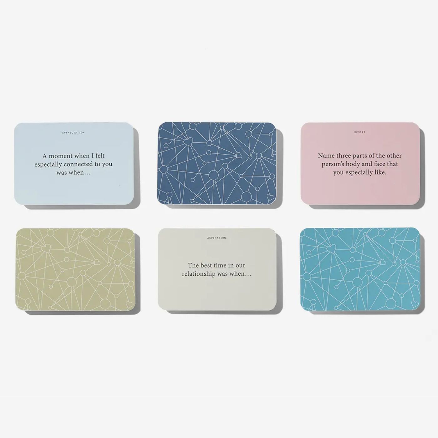 This is a pack of cards to foster connection and closeness, which can (strangely but truly) be generated almost on command by the right sort of conversations. Here are 100 questions that help couples to rekindle affection. They lead naturally to chats about what we are ready to forgive, what we deeply appreciate, what remains exciting and what is especially worth cherishing. This is a deceptively simple game with life-changing consequences.