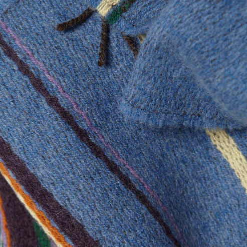 A fun, asymmetric design scarf featuring one side of condensed stripe, which dissipates throughout the middle before gathering again at the other end of the scarf.
