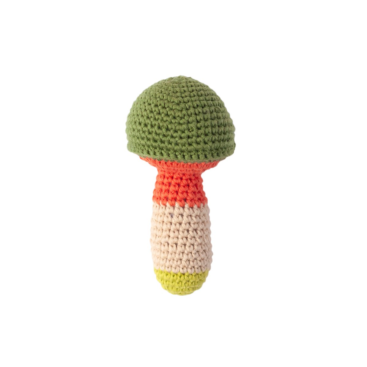 A charming handmade mushroom rattle, perfect for little nature enthusiasts.