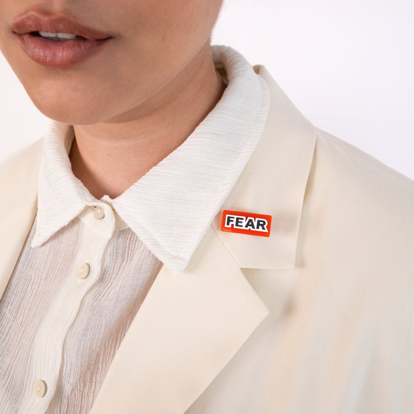 Pin on a piece of 80s art culture with the Gilbert and George Fear Brooch. A poignant moment in a subversive jewellery collaboration with the ultimate art duo, Tatty Devine expert jewellery makers have crafted these artists’ bold typographic style into a miniature red brooch. Featuring the word “FEAR” in bold, etched and hand-inked lettering, this piece is best paired with the coordinating Gilbert and George Hope Brooch.