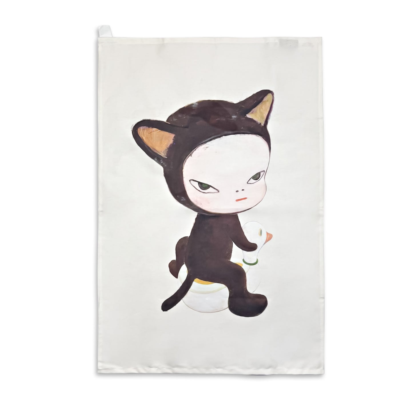 A tea towel exclusively designed for the Hayward Gallery Shop for the Yoshitomo Nara exhibition featuring Yoshimoto Nara's artwork Harmless Kitty, 1994.