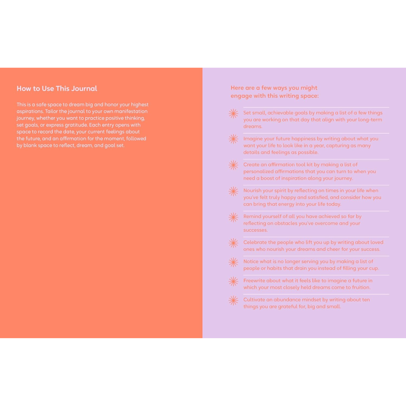 Inviting and brightly designed, this fill-in journal can be tailored to your own manifestation journey, whether you want to practice positive thinking, set goals, or express daily gratitude. Each entry includes: