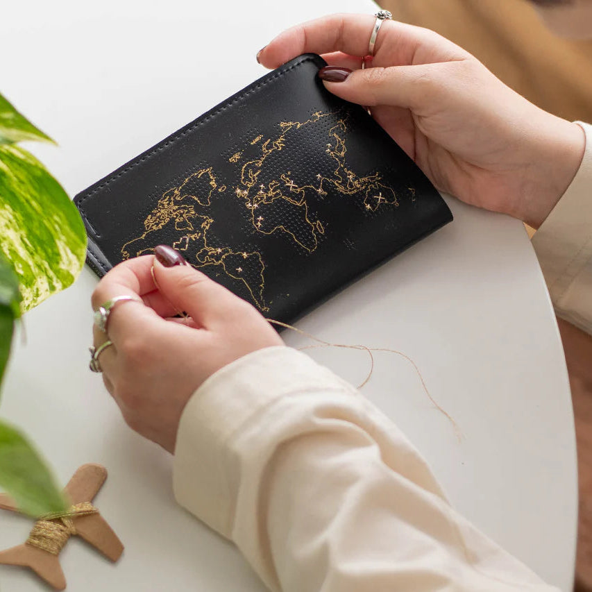 Stitch passport cover with world map design and red thread on a white background